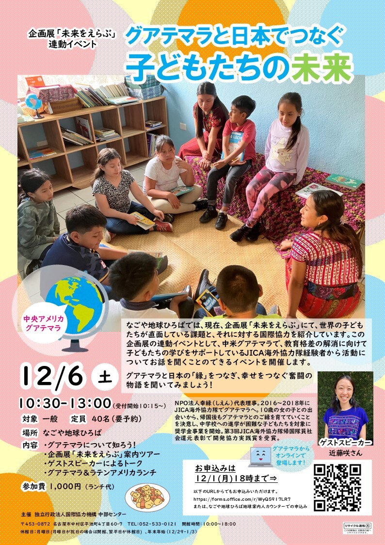 この企画展の連動イベントとして、教育格差の解消に向けて子どもたちの学びをサポートしているJICA海外協力隊経験者から、中米グアテマラでの活動についてお話を聞くことのできるイベントを開催します。
