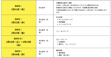 本プログラムは、宮古島に来島している観光客の滞在日数を増やすための施策を提案していただく5日間のプログラムです。