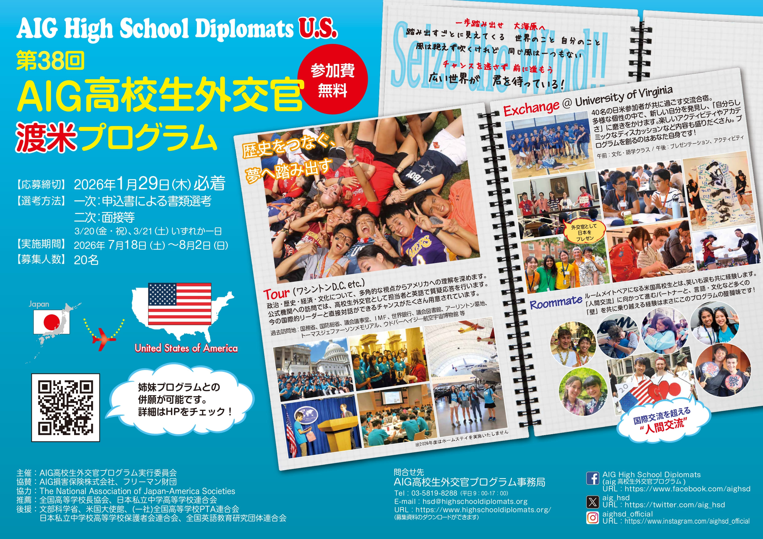 AIG高校生外交官渡米プログラム(AIG High School Diplomats U.S. Program/ HSD U.S.)は、毎年夏の約2週間、日本の高校生を高校生外交官として米国に派遣します。