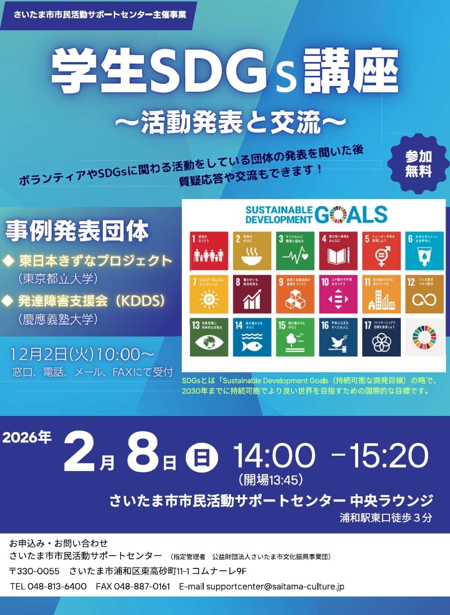 この講座では、東北地方でのボランティア活動をしている「東日本きずなプロジェクト」(東京都立大学ボランティアサークル)と、発達障害のある子どもたちに、遊びを通して支援活動をしている「KDDS(発達障害支援会)」(慶応義塾大学)にそれぞれお活動紹介や活動に対する思いをお話していただきます。