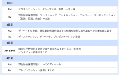 5つの構成で学ぶ Ayusa春キャンプのテーマは「英語で野生動物保護問題について考える」です。