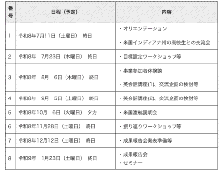 今回、この取組の一環として、国際交流に関心を持つ高校生や将来国際的なフィールドでの活躍を志す高校生を対象に、グローバル人材育成を目的とした研修および米国インディアナ州で現地学生との交流など実践的な学びの機会を提供する事業の参加者を募集します。