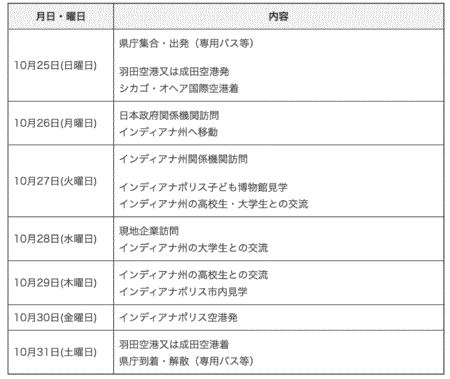 | 開催場所 | グローバル人材育成研修:群馬県庁会議室等 現地研修:アメリカ合衆国 インディアナ州 |