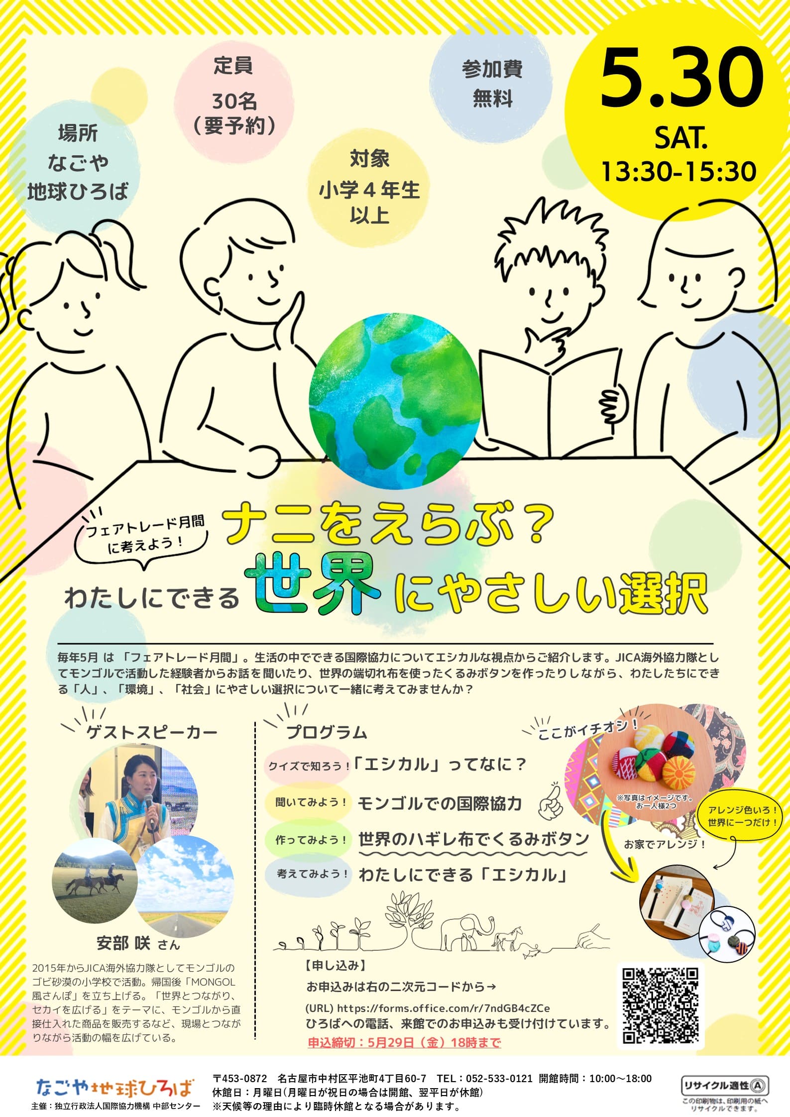 JICA海外協力隊としてモンゴルで活動した経験者からお話を聞いたり、世界の端切れ布を使ったくるみボタンを作ったりしながら、わたしたちにできる「人」、「環境」、「社会」にやさしい選択について一緒に考えてみませんか?